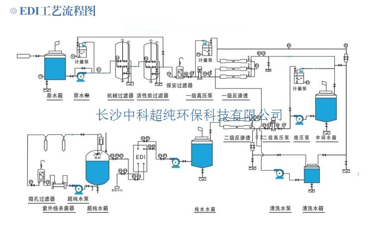 連接管道:將進水管道連接到EDI模塊的進水口,出水管道連接到出水口。連接時,應確保管道連接緊密,無泄漏。根據需要,可以安裝閥門和流量計來控制水和化學藥劑的流量。